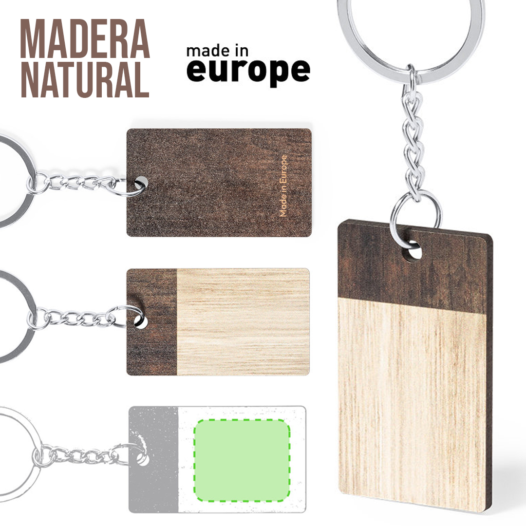 Llavero rectangular, fabricado en madera natural y de original acabado bicolor. Amplia superficie de marcaje, con anilla y cadena metálicas y distintivo Made In Europe.
