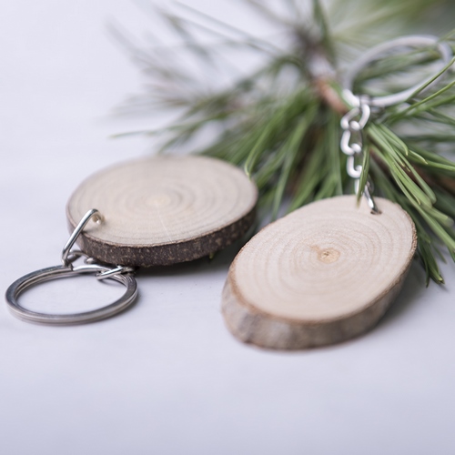 Elegante llavero de línea nature. Piezas obtenidas al corte de madera de haya, por lo que su textura, color y grosor pueden variar, convirtiéndolo así en una pieza única.Con amplia superficie de marcaje y disponible en diseños ovalado y redondeado.