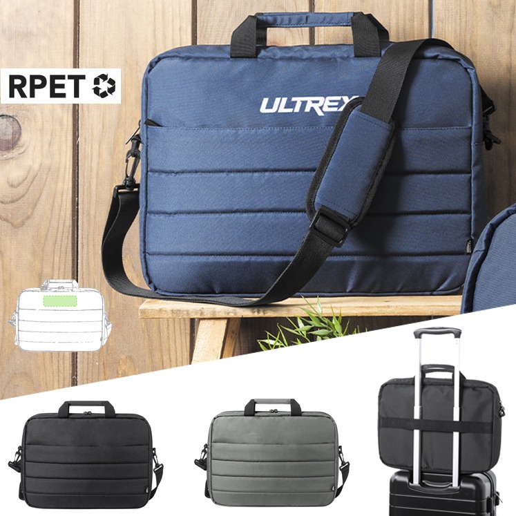 Maletín de línea nature con diseño urbano y acolchado total. Fabricado en resistente RPET 300D elaborado a partir de plástico reciclado, para así fomentar la reutilización de residuos plásticos y contribuir a la sostenibilidad del planeta. Accesorio para ajuste en trolley, con compartimento interior acolchado para ordenador portátil de hasta 15 pulgadas. Bolsillo principal con cierre de cremallera y tirador metálico. Cómodas asas de transporte reforzadas y cinta bandolera ajustable, con refuerzo acolchado para hombro y cierres giratorios de mosquetón. Distintivo RPET en etiqueta. Acolchado. Bolsillo Acolchado para Portátil