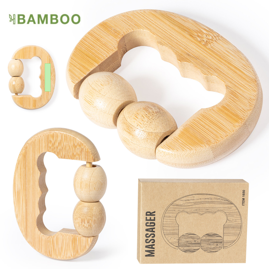 Masajeador de línea nature, fabricado en en bambú. Con 2 bolitas masajeadoras a juego y asa ergonomica. Presentación en caja individual de diseño kraft.