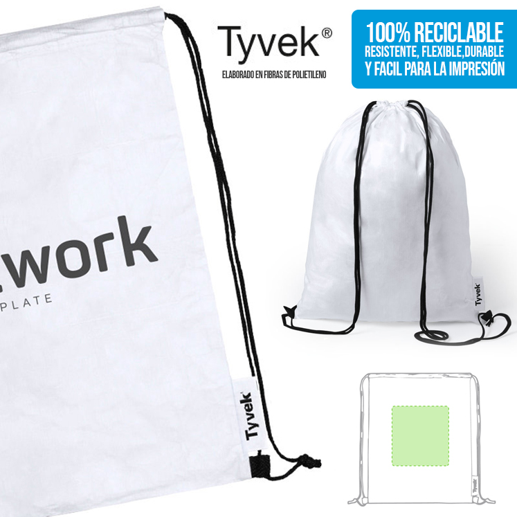 Mochila de cuerdas en suave y ligero material Tyvek®, 100% reciclable y elaborado a partir de fibras de polietileno, que destaca especialmente por su resistencia, flexibilidad, durabilidad y facilidad para la impresión. Con cuerdas autocierre en color negro y esquinas reforzadas. Con distintivo Tyvek® en etiqueta lateral.