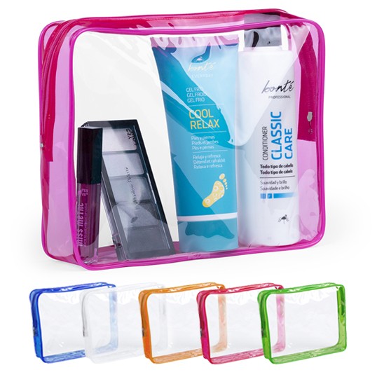 Neceser multiusos en resistente material PVC. Diseño en combinación de materiales translúcidos y transparentes. Disponible en vivos colores, con cierre de cremallera a juego.