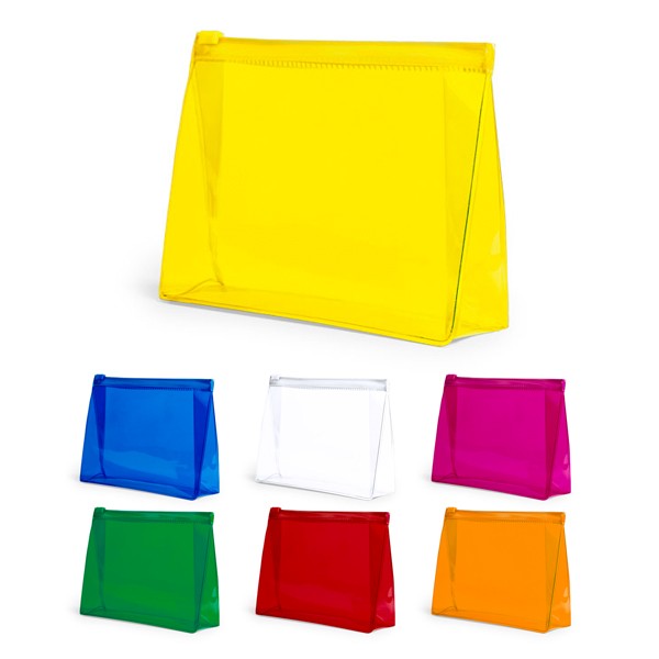 Neceser multiusos en resistente PVC transparente de variada gama en vivos colores. Con cierre hermético a juego.