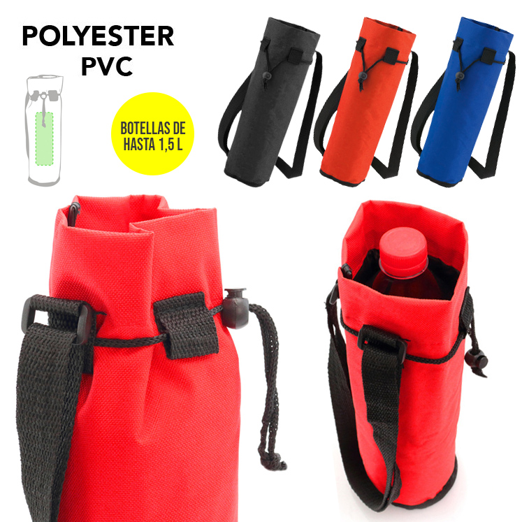 Nevera para botellas de hasta 1,5l en resistente poliéster 600D de vivos colores. Con cierre de cordón y cómoda cinta para hombro en nylon ajustable. Interior isotermo en acabado de PVC. Botellas hasta 1,5 l