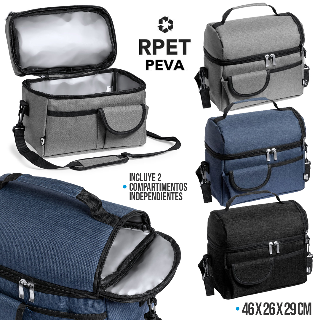 Nevera fabricada en resistente 600D RPET. Incluye 2 compartimentos independientes, con cierre de cremallera y tiradores metálicos. Interior isotermo en PEVA, con cinta bandolera ajustable y acolchado para hombro a juego. Bolsillo trasero de redecilla elástica y dos bolsillos frontales, uno de ellos con cierre de velcro. Etiqueta exterior con distintivo RPET, disponible en variada gama de colores. El material RPET se elabora a partir de plástico reciclado, para así fomentar la reutilización de residuos plásticos y ayudar a la sostenibilidad del planeta.