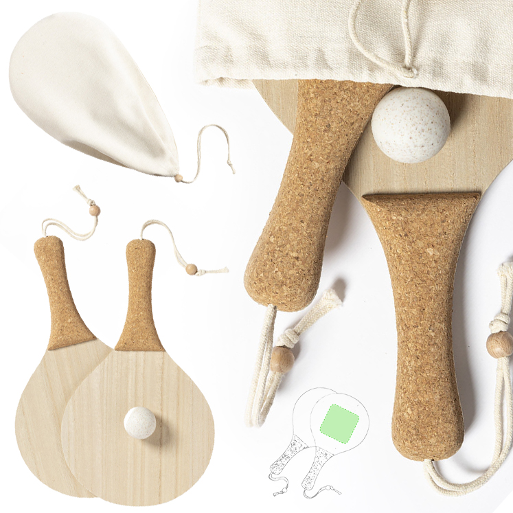 Par de palas de playa de línea nature. Fabricadas en madera, con mango reforzado en corcho natural y cintas para muñeca con ajustador. Presentadas en bolsa de algodón natural con cierre de cordón y pelota en caña de trigo. Funda Algodón