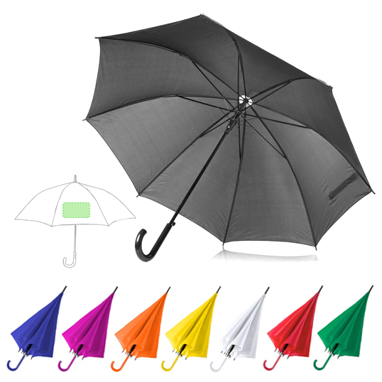 Paraguas de 8 paneles en extensa gama de vivos colores y 105cm de diámetro. De apertura automática, en resistente material poliéster, con varillas metálicas en color negro y mango a juego. 23"". Automático
