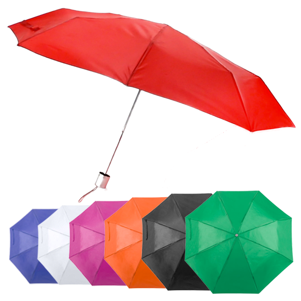 Paraguas plegable de 8 paneles de poliéster 170T en extensa gama de vivos colores y 96cm de diámetro. De apertura manual, con varillas metálicas en color plateado, cierre de velcro y cinta de transporte en mango ergonómico. Presentado en funda individual a juego. 21"". Funda Poliéster