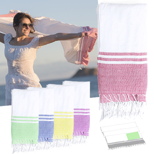 Pareo toalla 2 en 1 en combinación de materiales algodón y poliéster de 180g/m2 en vivos colores. Cara posterior absorbente con acabado en rizo.