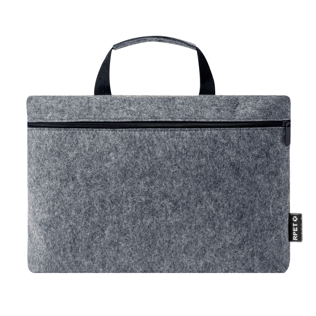 Portadocumentos en resistente fieltro RPET efecto melange. Compartimento principal con cierre de cremallera, para ordenador portátil de hasta 15 pulgadas, y pequeño bolsillo interior. Con resistentes asas a juego con detalles en negro. Logotipo RPET en etiqueta exterior. El fieltro RPET es fruto de la combinación del proceso de reciclaje de materiales plásticos junto con la técnica milenaria de fabricación del fieltro, dando como resultado un material de eco-tendencia que, además de ser de origen reciclado, también se convierte en reciclable.