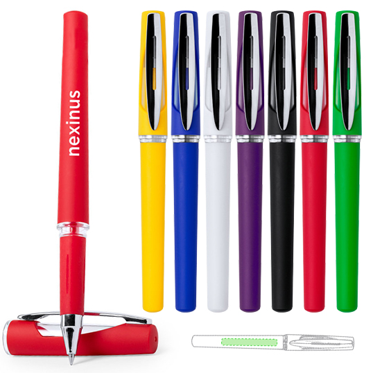Roller de capucha de alegre diseño bicolor con cuerpo de suave acabado en llamativos colores y accesorios en color plateado brillante, con detalle transparente. Tinta gel azul. Carga Jumbo