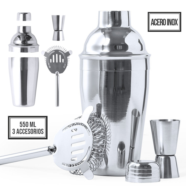 Set cóctel de 3 accesorios, fabricado en acero inox de acabado cromado. Incluye: Cocktelera de 550ml de capacidad, con cierre de seguridad y tapón dosificador en parte superior.Colador con asa.Medidor single/double. Coctelera 550 ml. 3 Accesorios
