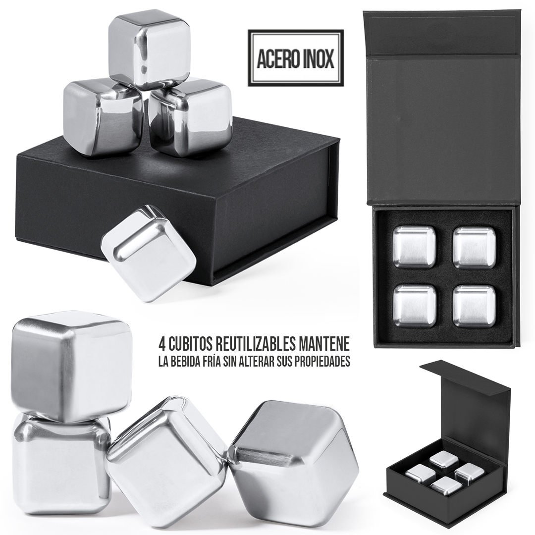 Set de 4 cubitos reutilizables. Fabricados en acero inoxidable, manteniendo la bebida fría sin alterar sus propiedades al no diluir su contenido en agua, además de mantener el sabor original de la misma. Presentados en elegante estuche color negro con interior troquelado. Reutilizable. 4 Piezas
