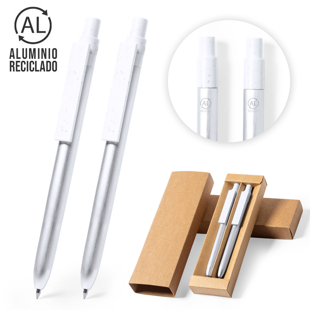 Set eco-friendly de bolígrafo y roller, fabricados en aluminio reciclado y con detalles en ABS reciclado (RABS). Incluye: Bolígrafo en aluminio reciclado de mecanismo pulsador, con cuerpo en color plateado y accesorios en blanco. Con distintivo aluminio reciclado en la parte superior del bolígrafo, cartucho jumbo y tinta azul. Roller en aluminio reciclado de mecanismo pulsador, con cuerpo en color plateado y accesorios en blanco. Con distintivo aluminio reciclado en la parte superior del roller, cartucho jumbo y tinta azul.Set presentado en estuche individual de diseño kraft con funda a juego.El origen del aluminio reciclado se encuentra en la reutilización casi infinita de uno de los materiales con mayor potencial de reciclabilidad sin perder sus propiedades. Esta característica lo convierte en un material eco-friendly de origen reciclado, fácilmente reciclable y de cuyos procesos de tratamiento y desechos para la obtención del material se pueden obtener nuevos recursos reutilizables, consumiendo menos energía en su fabricación, entre otros factores de sostenibilidad.Certificación GRS (Global Recycled Standard / Estándar de Reciclaje Global), que garantiza el origen reciclado del material usado para fabricar el producto. Bolígrafo y Roller. Carga Jumbo