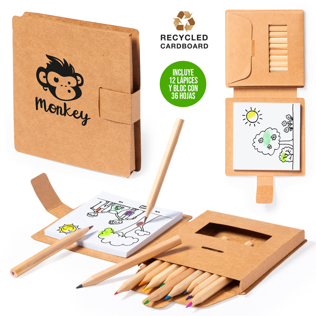 Set para colorear de línea nature fabricado en cartón reciclado y con cinta de cierre en solapa. Incluye: Bloc de 36 hojas con dibujos de naturaleza para colorearCaja de 12 lápices de madera con minas en multitud de colores. 12 Lápices. Bloc 36 Hojas