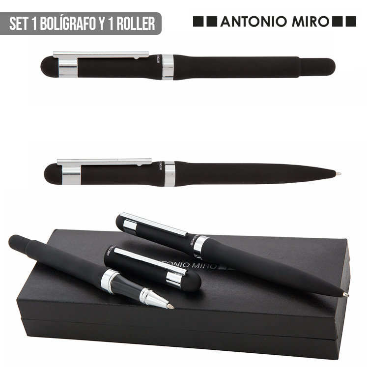 Elegante set de Antonio Miró con bolígrafo de mecanismo giratorio y roller de capucha y original anilla en sobrio diseño. De cuerpo metálico en acabado negro brillante con clip plateado. Presentado en elegante estuche individual en color negro con logotipo de la marca y funda. En tinta azul. Bolígrafo y Roller