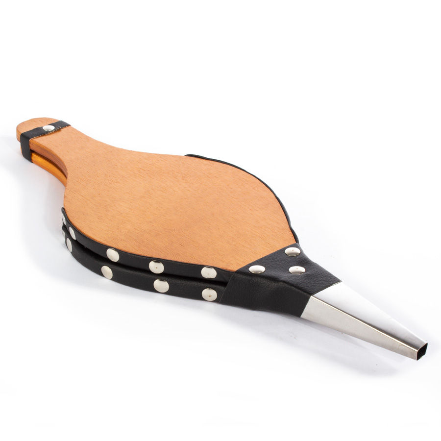 Soplador pequeño de aire tipo Acordeón, para chimemeas y parrillas. Superficie MDF, reforzado con cuero y tachas. Toma de aire posterior. Amplia superficie para logo.