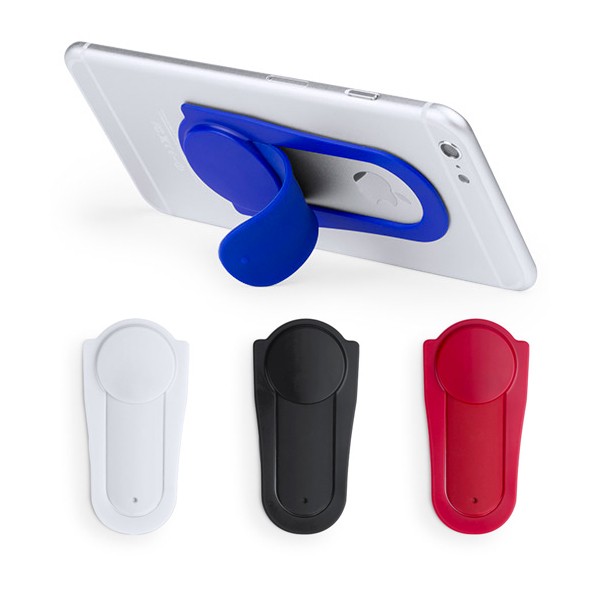 Soporte de suave silicona para dispositivo móvil. Original diseño en llamativos colores y sistema de fijación mediante ventosa, mecanismo desplegable y presentado en atractiva bolsa de diseño. Adhesivo