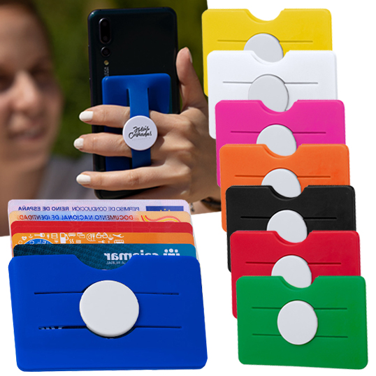 Tarjetero con sporte para smartphone. En materiales ABS y silicona, con adhesivo 3M, de fijación extra fuerte y libre de residuos al despegarlo del dispositivo. Tarjetero con capacidad para 4-5 tarjetas y disponible en llamativos colores, con soporte para los dedos en color blanco. Adhesivo. 1 Compartimento