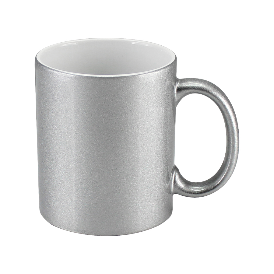 Tazón Cerámico exterior plateado, interior blanco. Con cobertura exterior especial "Polycoat" para sublimación. Cada tazón se entrega dentro de su caja individual de cartón blanco.