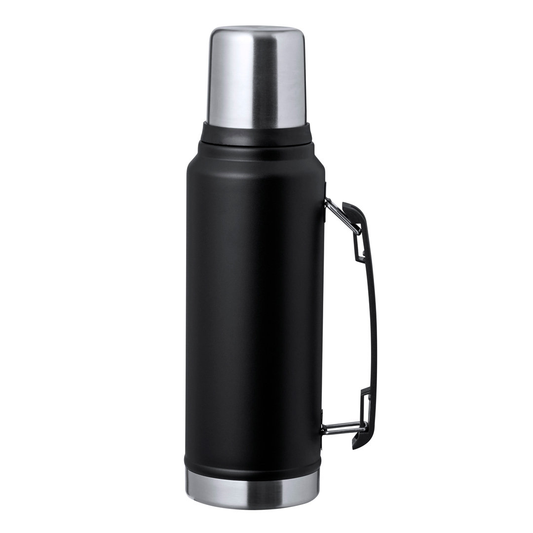 Termo de acero inox de 1L de capacidad. Combinación de color negro con acero pulido de elegante acabado, de cierre de rosca con tapón en forma de vaso de 200 ml y asa en el lateral para un fácil transporte. Presentado en caja de diseño kraft. 1 L. Vaso 200 ml