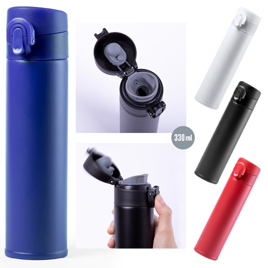 Termo en acero inox de 330ml de capacidad. Con doble cobertura para mejor y mas duradera conservación de la temperatura y con sistema de apertura fácil con botón. Disponible en variada gama de colores y presentado en atractiva caja de diseño. 330 ml