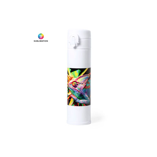 Termo en acero inox de 330ml de capacidad. Con doble cobertura para mejor y mas duradera conservación de la temperatura, con cierre de seguridad y sistema de apertura fácil con botón. Especialmente fabricado para impresión en sublimación y presentado en atractiva caja de diseño, 330 ml