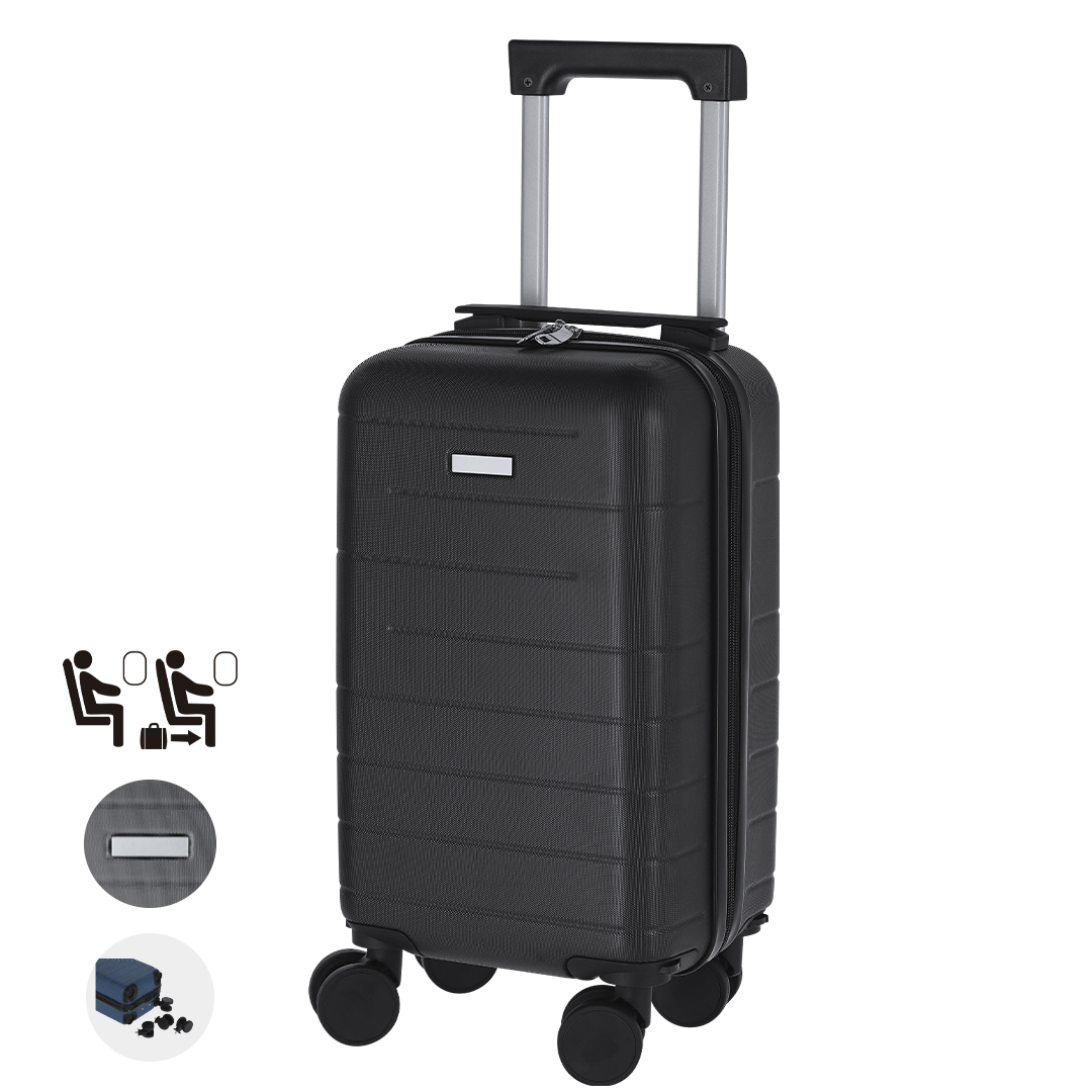 Práctico trolley de 4 ruedas giratorias extraíbles, en rígido ABS. Cierre de cremallera de doble tirador. Interior con compartimentos y diversos. Gracias a su tamaño compacto y a la extracción de las ruedas llevar un trolley como equipaje de manos no será un problema. Incluye bolsa para guardar las ruedas.