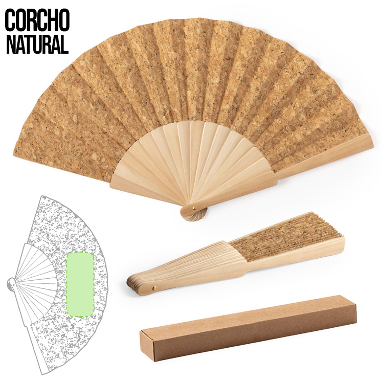 Abanico de línea nature, con varillas de madera y tela en corcho natural. Presentado en caja individual de diseño eco.