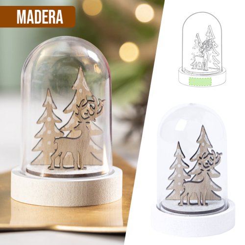 Adorno de navidad de original diseño con reno y árbol de navidad en su interior. Fabricada en resistente material acrílico, con base de madera lisa para impresión. Presentada en caja individual en color natural.
