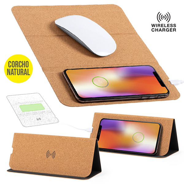 Alfombrilla de línea nature en corcho natural. Con cargador inalámbrico integrado -cable Tipo C incluido-, base antideslizante y soporte para móvil integrado. Compatible con dispositivos equipados con tecnología de carga inalámbrica y presentada en atractiva caja de diseño eco. Inalámbrico 5W. Antideslizante