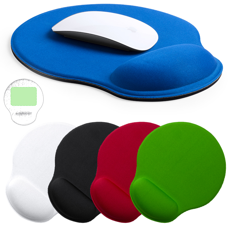 Alfombrilla para ratón fabricada en suave poliéster. Con base antideslizante en silicona y reposa muñecas acolchado para prevenir el estrés y el dolor en las articulaciones. Disponible en variada gama de colores. Reposamanos Acolchado. Antideslizante