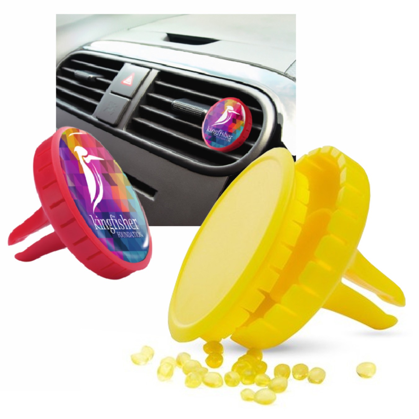 Ambientador aroma limón para rejilla de automóvil. Con cuerpo acabado en divertidos colores y troquelado especial para marcaje en doming/gota de resina. Aroma Limón