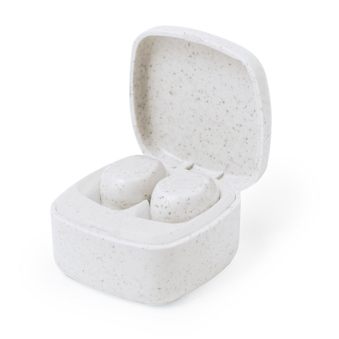 Auriculares intraurales fabricados en caña de trigo, con conexión Bluetooth® 5.0. De diseño ergonómico, incluyen botón de control táctil integrado en el auricular, cada uno con una batería de 30 mAh. Base de carga a juego con batería de 200mAh y luz LED de estado de carga. Función manos libres y recargables, con cable Tipo C incluido. Presentados en estuche individual de lujo con tapa de bisagra y en caja de diseño kraft. Disponibles en variada gama de colores, combinando la caña de trigo en color natural con originales tonos. Incluido manual de instrucciones en español e inglés. La caña de trigo fomenta la utilización de materias primas naturales, reduciendo así las emisiones contaminantes. Fabricados conforme a los estándares RoHS y en cumplimiento con los siguientes requisitos de seguridad: Sistema de protección contra sobrecalentamiento. Sistema de protección contra sobrecarga. Sistema de bloqueo para evitar cortocircuitos. Conexión Bluetooth. Batería 30 mAh/ Base Carga 200 mAh
