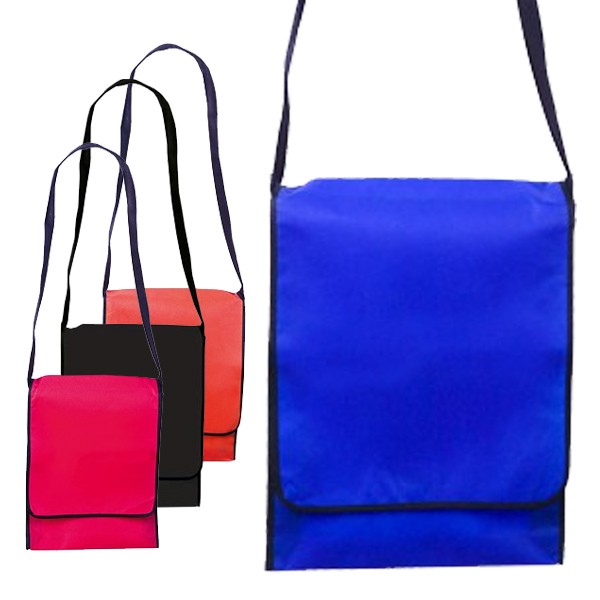 Bandolera de gran tamaño en non-woven, de diseño bicolor en variados colores y cierre de solapa de velcro. Con cómoda cinta para hombro.