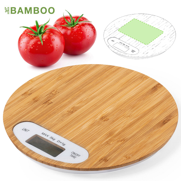 Báscula de cocina de línea nature en bambú pulido. Display digital, con funciones de apagado automático, tara y selección de unidad de pesaje. Alimentación a pilas (de botón incluidas) y peso máximo 5kg. Presentada en atractiva caja de diseño eco. Pila Botón Incluida