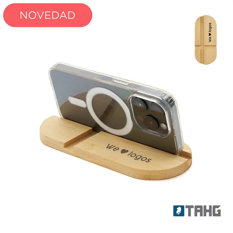 Soporte de escritorio fabricado en bambú, diseñado para adaptarse tanto a teléfonos como a tablets.