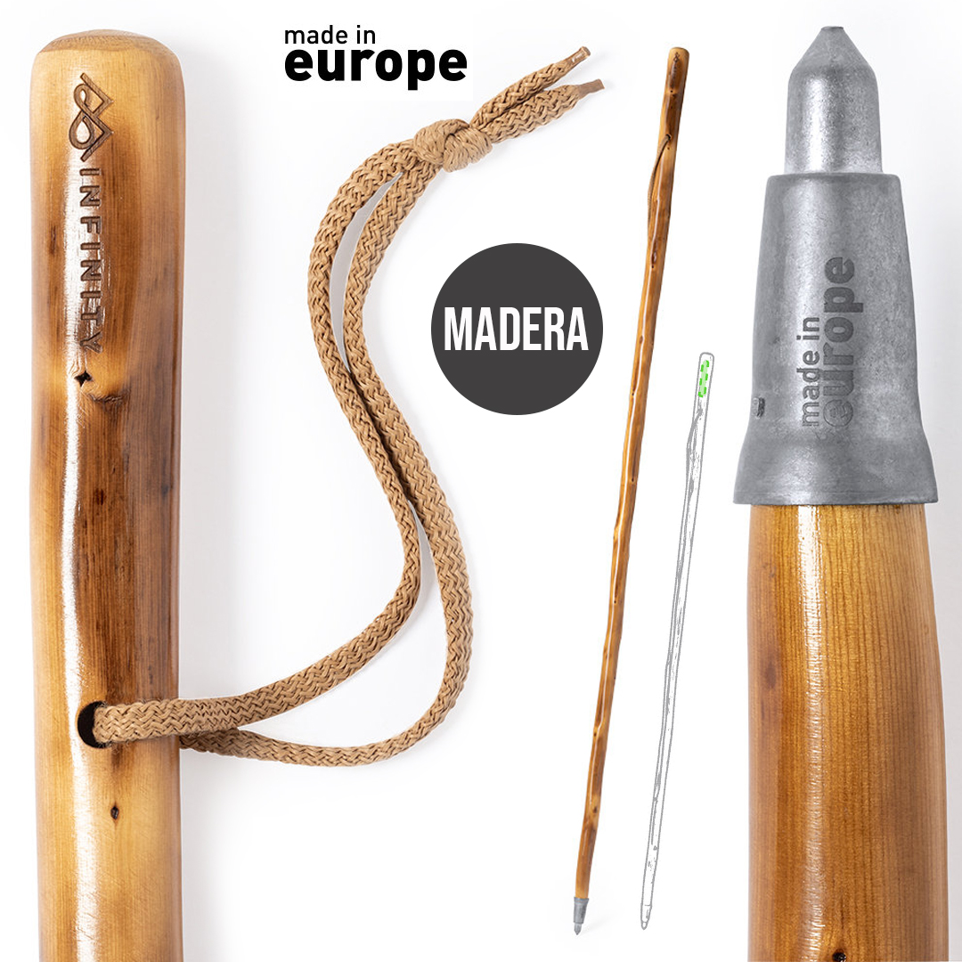 Clásico bastón para caminar, fabricado en resistente y flexible madera natural. Con punta metálica y distintivo Made In Europe.