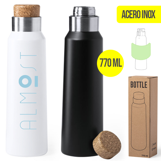 Bidón de inspiración nature en alta calidad y de gran capacidad -770 ml-. En acero inox, con tapón de diseño inspirado en el corcho. Disponible en elegantes colores blanco y negro y presentado en atractiva caja de diseño eco. 770 ml