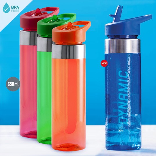 Bidón en alta calidad y de gran capacidad -650 ml- en material tritán resistente al calor y libre de BPA. Con anilla de acero inoxidable y papón dosificador a rosca, con asa integrada a juego. Disponible en variada gama de colores transparentes. 650 ml