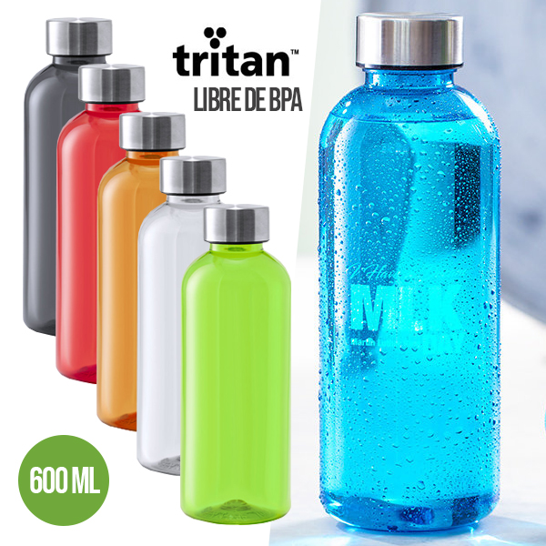 Bidón de 600ml de capacidad. Libre de BPA, con cuerpo fabricado en tritán transparente y de alta resistencia al calor. Tapón a rosca en acero inox. Disponible en variada gama de colores. 600 ml
