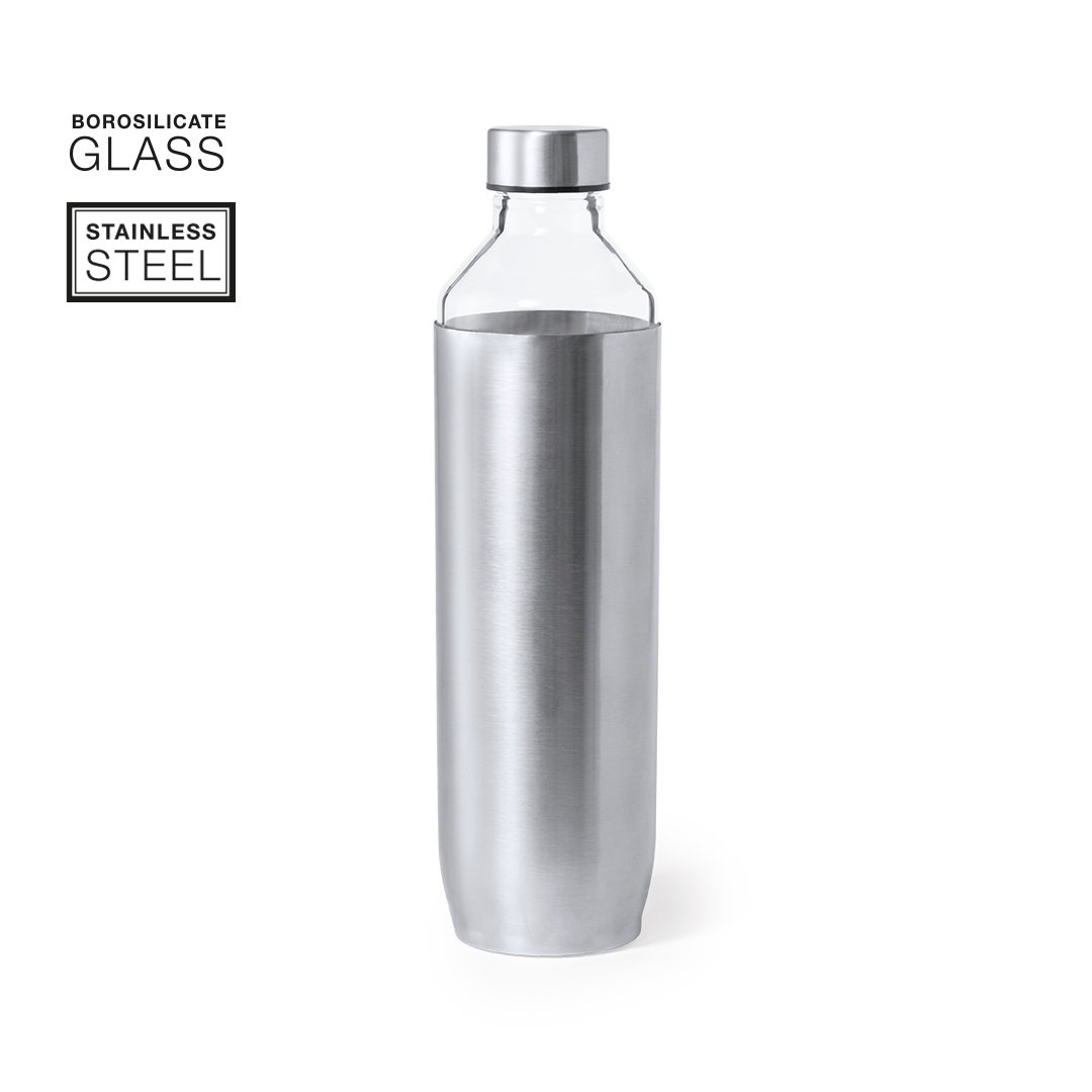 Bidón de diseño en alta calidad, de 850 ml de capacidad. Fabricado en cristal de borosilicato, que ofrece una resistencia, estética y durabilidad excepcionales, alargando su vida útil y pudiendo ser reutilizado infinidad de veces. Tapón y funda del cuerpo del bidón en acero inox. Presentado en atractiva caja de diseño. 850 ml