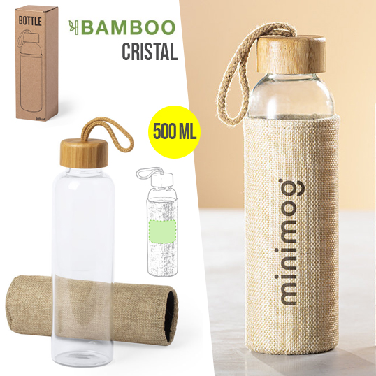 Bidón de línea nature en combinación de materiales bambú y cristal. 500 ml de capacidad, con tapón a rosca en bambú y funda en acabado de inspiración eco. Asa de transporte en color nature y presentado en atractiva caja de diseño eco. 500 ml. Funda Poliéster
