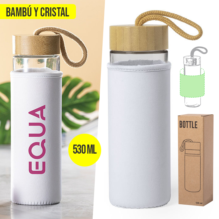 Bidón de línea nature en combinación de materiales bambú y cristal. 530 ml de capacidad, con tapón a rosca en bambú y funda en elegante color blanco. Asa de transporte en color nature y presentado en atractiva caja de diseño eco. 530 ml. Funda Soft Shell
