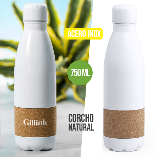 Bidón de línea nature y 750ml de capacidad. Cuerpo en acero inox de color blanco mate, con franja central en corcho natural. Tapón de seguridad de rosca a juego y presentado en atractiva caja de diseño eco. 750 ml