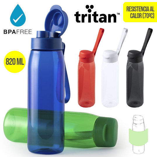 Bidón en alta calidad y de gran capacidad -820 ml- en material tritán resistente al calor y libre de BPA. Disponible en variada gama de colores transparentes, con tapón dosificador de seguridad a juego y cinta de transporte. 820 ml