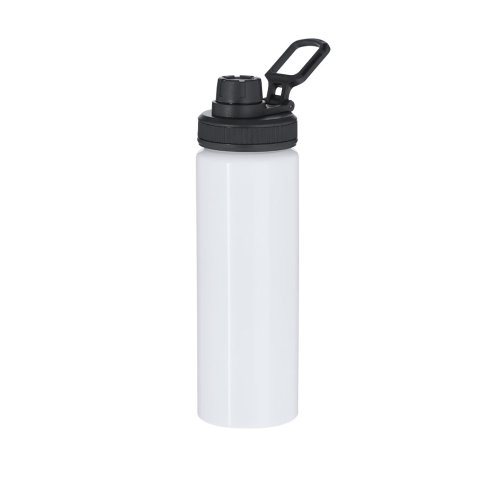Bidón de aluminio con 800 ml de capacidad. En color blanco brillante, especialmente diseñado para la sublimación. Incluye tapadera color negro con sistema de cierre a rosca, agarre de silicona gris para un óptimo sellado, dosificador y asa para transporte ajustable. Libre de BPA. 800 ml