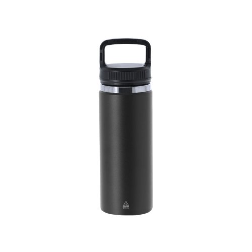 Bidón térmico de 550 ml de capacidad, fabricado en acero inox reciclado de doble pared. Cuenta con un asa funcional con doble función de mosquetón, que facilita un transporte cómodo y versátil. Con tapadera a rosca y base en color mate, complementada con un elegante aro decorativo en plata. Libre de BPA.El acero es uno de los materiales más demandados y que puede encontrarse casi en todas partes, desde productos de uso diario a grandes construcciones. Con innumerables propiedades, entre las que cabe destacar la durabilidad y su alto grado de reutilización, convirtiéndolo en una alternativa muy valorada en soluciones de sostenibilidad. Debidamente tratado, permite obtener nuevos recursos de infinita utilización. 550 ml