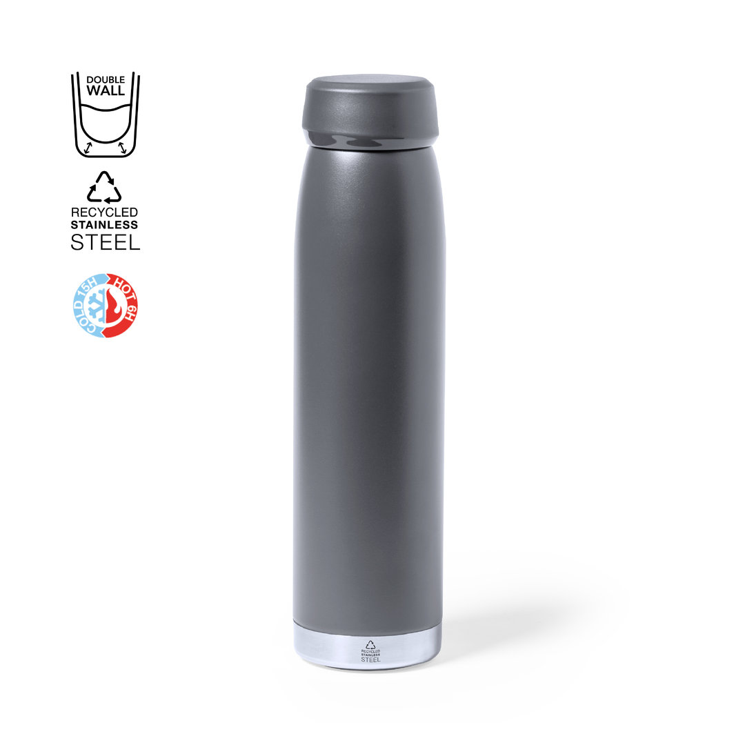 Bidón térmico de 380 ml de capacidad, fabricado en acero inox reciclado de doble pared, con tapón a rosca a juego y base en plata. Disponible en variada gama de colores satinados, libre de BPA y presentado en caja individual de diseño kraft. El acero es uno de los materiales más demandados y que puede encontrarse casi en todas partes, desde productos de uso diario a grandes construcciones. Con innumerables propiedades, entre las que cabe destacar la durabilidad y su alto grado de reutilización, convirtiéndolo en una alternativa muy valorada en soluciones de sostenibilidad. Debidamente tratado, permite obtener nuevos recursos de infinita utilización. 380 ml