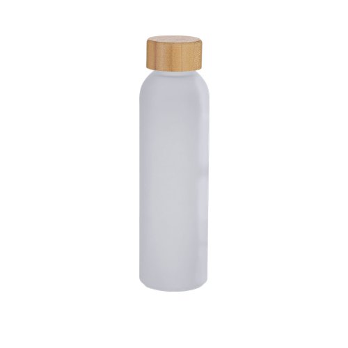 Bidón en Cristal Reciclado, acabado frosted, de 500 ml de capacidad y tapón en bambú. Incluye distintivo de Recycled Glass. 500 ml